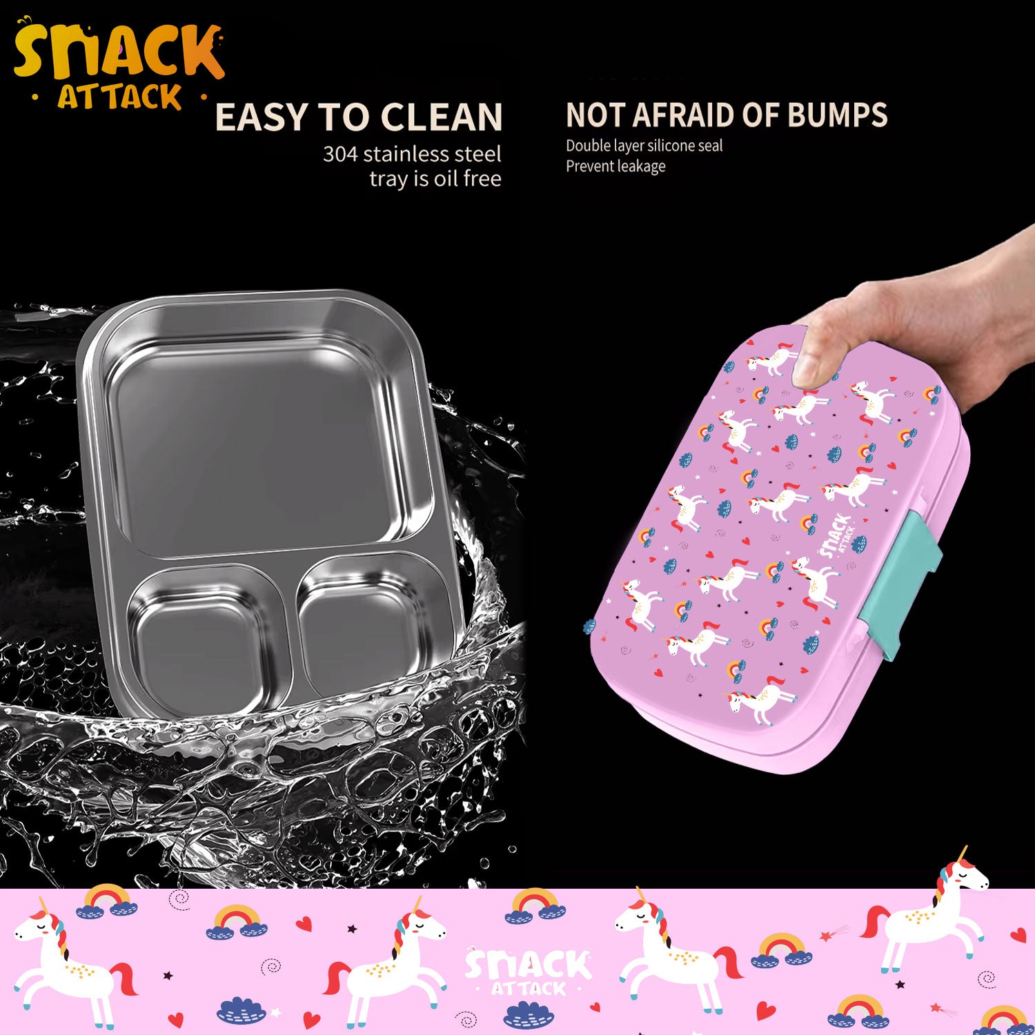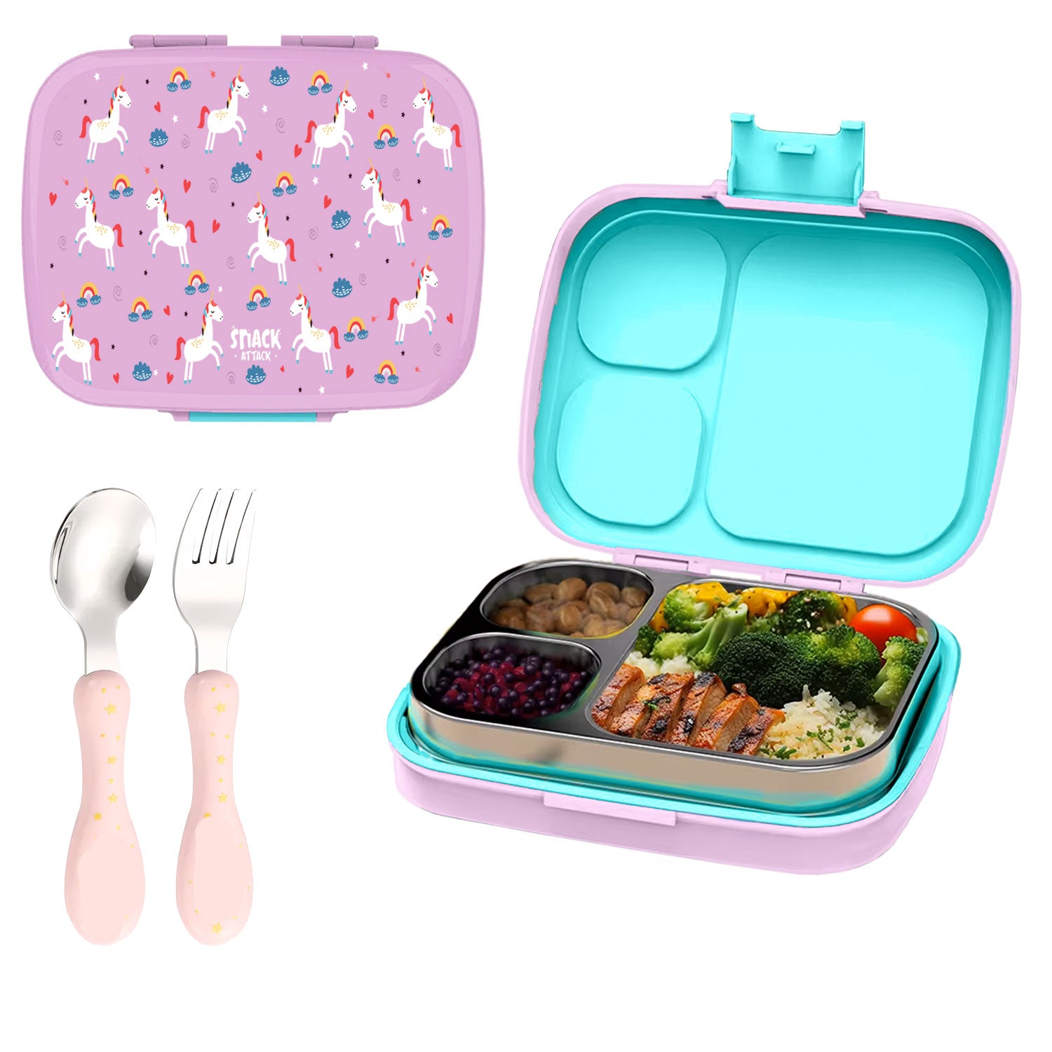 Bento Stainless Steel Lunch Box for Kids –3 Compartments |Unicorn Design Toddler with Spoon & Fork