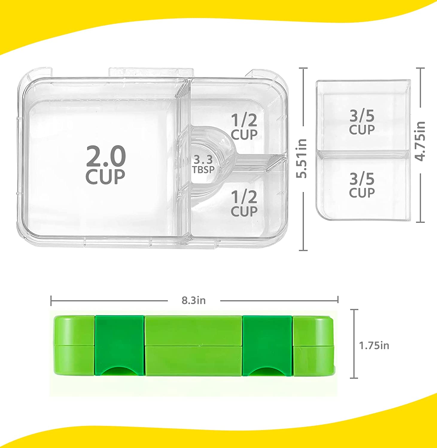 - Six 1/2 cup of portions (approximately 2.75 cups) of the key food groups plus dip/treat well.