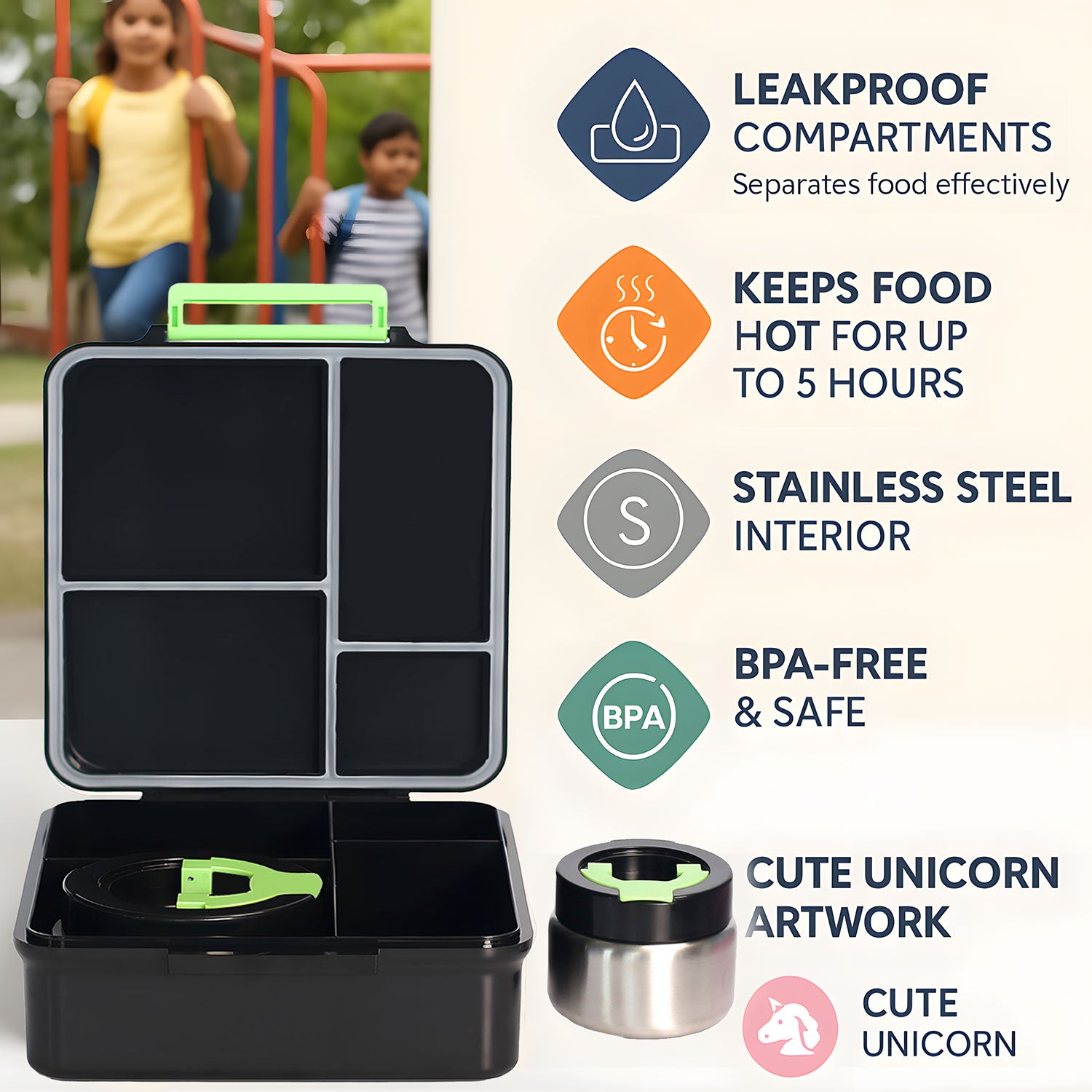 • 💎Leak-Proof Bento Box and Food jar: You will get 3 or 5 compartments (with two food dividers) to keep food separated and fresh. What you get: 1 lunch box kids, one insulated food jar and a set of cutlery (spoon and fork). Lunch box capacity: food jar capacity: 9.7 oz.