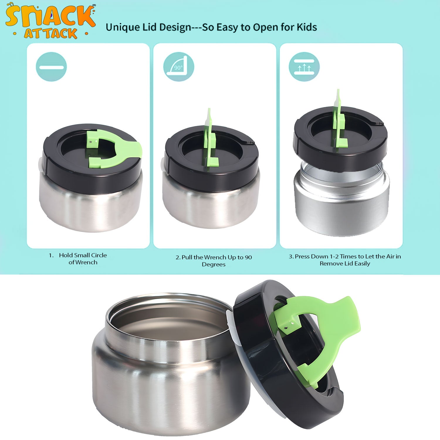 🟢More accessible, Faster Lunch Prep: Kids eat better, and now you can deliver hot soup and chilled strawberries without using a million little lunch boxes. Snack Attack is a kid's bento box with a Thermos that packs hot and cold food. This insulated lunch box for kids is perfect for hot lunches, cold meals, or snacks. You won't find another hot food-insulated lunch box that works like Snack Attack ! The product is suitable for children over three years old.