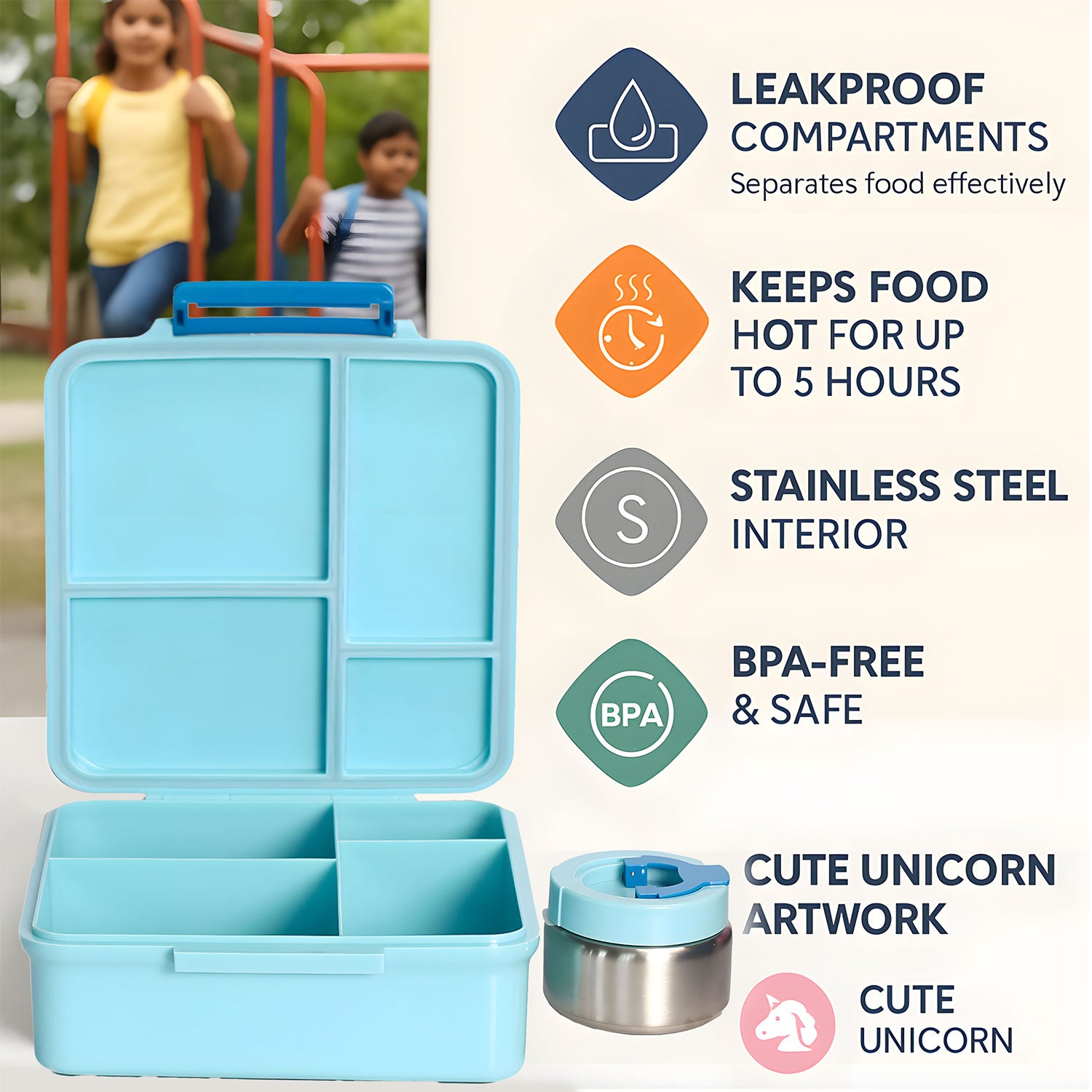• 💎Leak-Proof Bento Box and Food jar: You will get 3 or 5 compartments (with two food dividers) to keep food separated and fresh. What you get: 1 lunch box kids, one insulated food jar and a set of cutlery (spoon and fork). Lunch box capacity: food jar capacity: 9.7 oz.