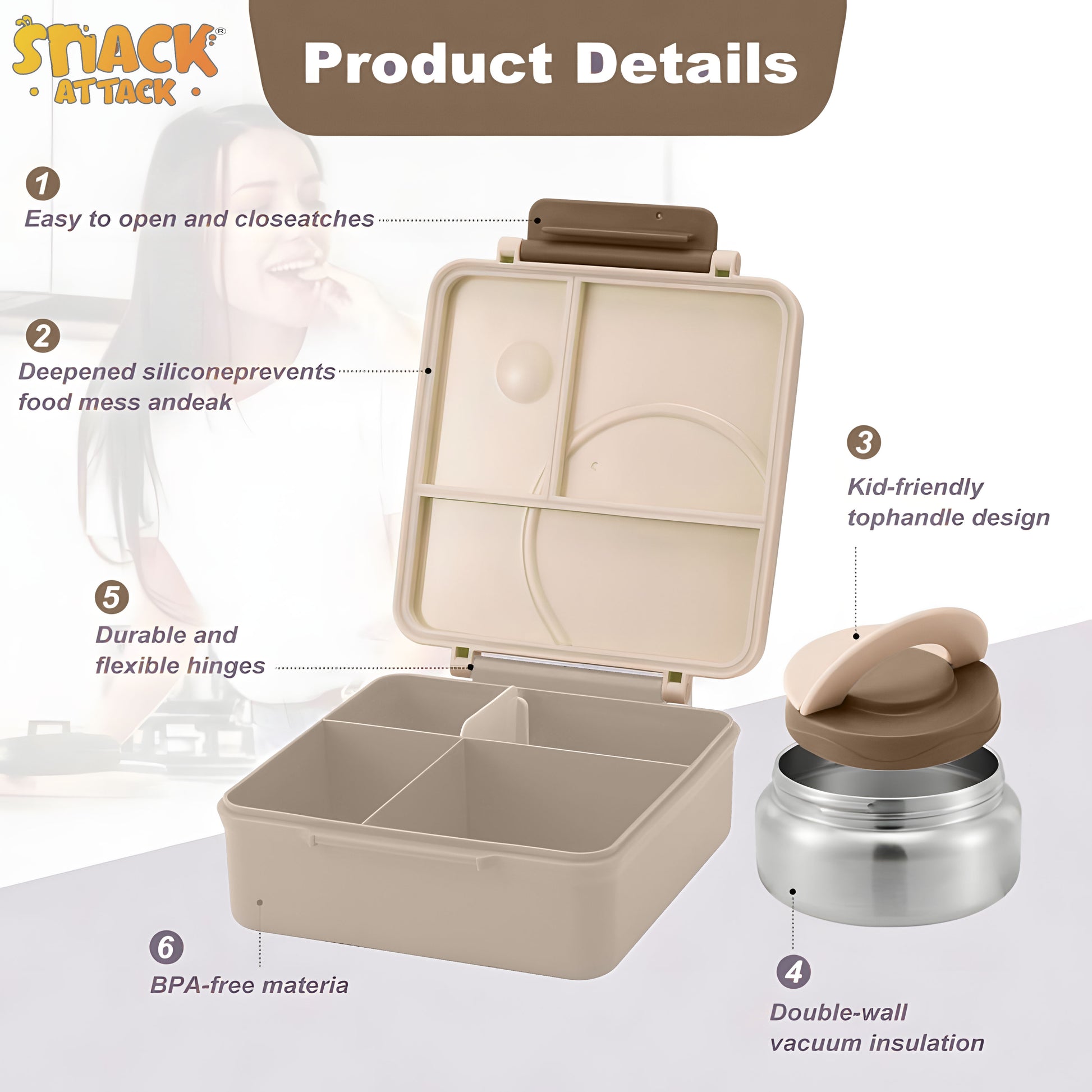• 🟢More accessible, Faster Lunch Prep: Kids eat better, and now you can deliver hot soup and chilled strawberries without using a million little lunch boxes. Snack Attack is a kid's bento box with a Thermos that packs hot and cold food. This insulated lunch box for kids is perfect for hot lunches, cold meals, or snacks. You won't find another hot food-insulated lunch box that works like Snack Attack ! The product is suitable for children over three years old.