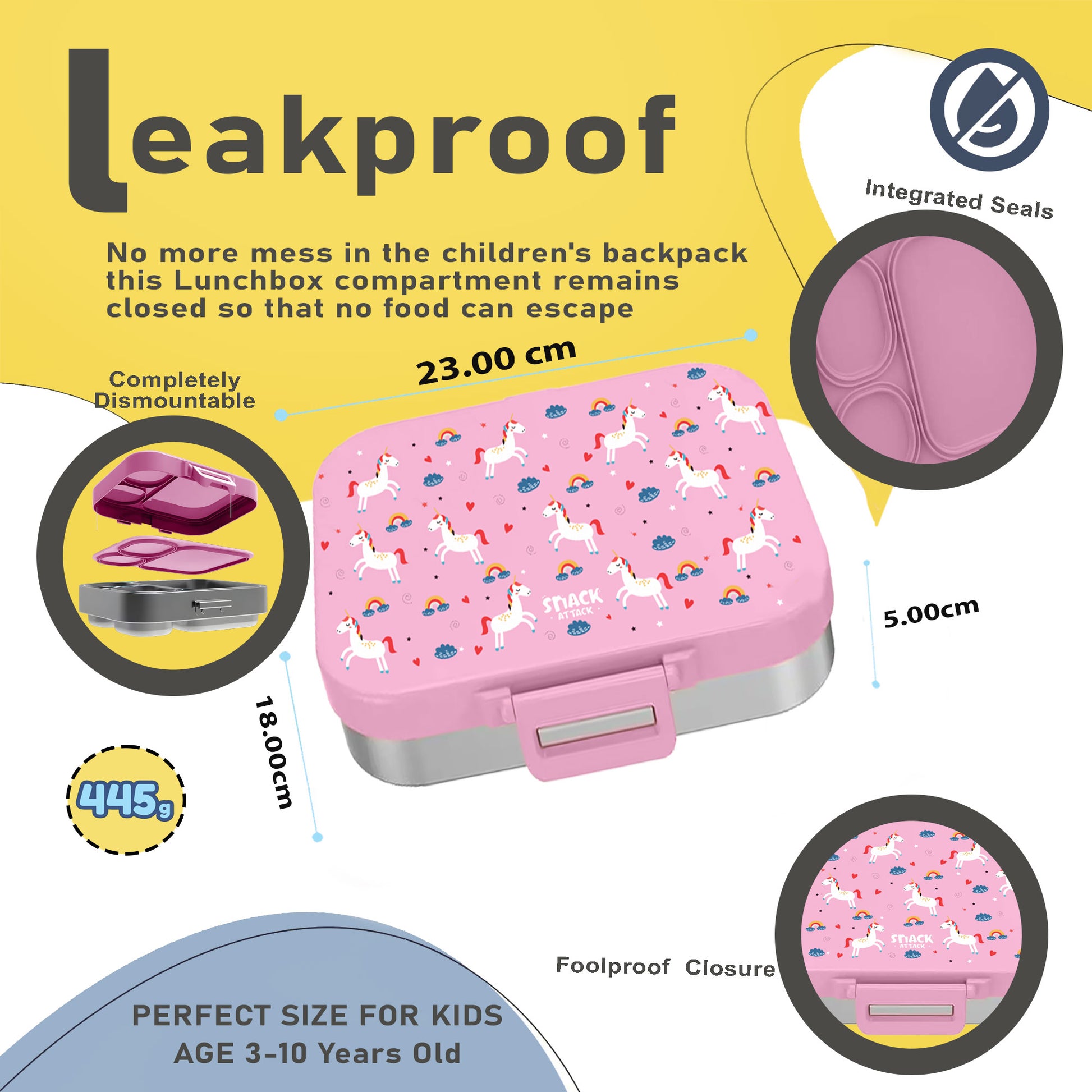 Make lunchtime magical with the Snack Attack Unicorn Stainless Steel Bento Lunch Box—the perfect blend of function and fun! Designed with children in mind, this lunch box features a convertible tray with 3 compartments to suit different meals, a leakproof silicone seal to keep food fresh and separate, and a charming unicorn-themed exterior your little one will love. Crafted from high-quality, food-grade materials, it’s safe, durable, and comes complete with a matching spoon and fork. Ideal for school, picnics, or daycare!