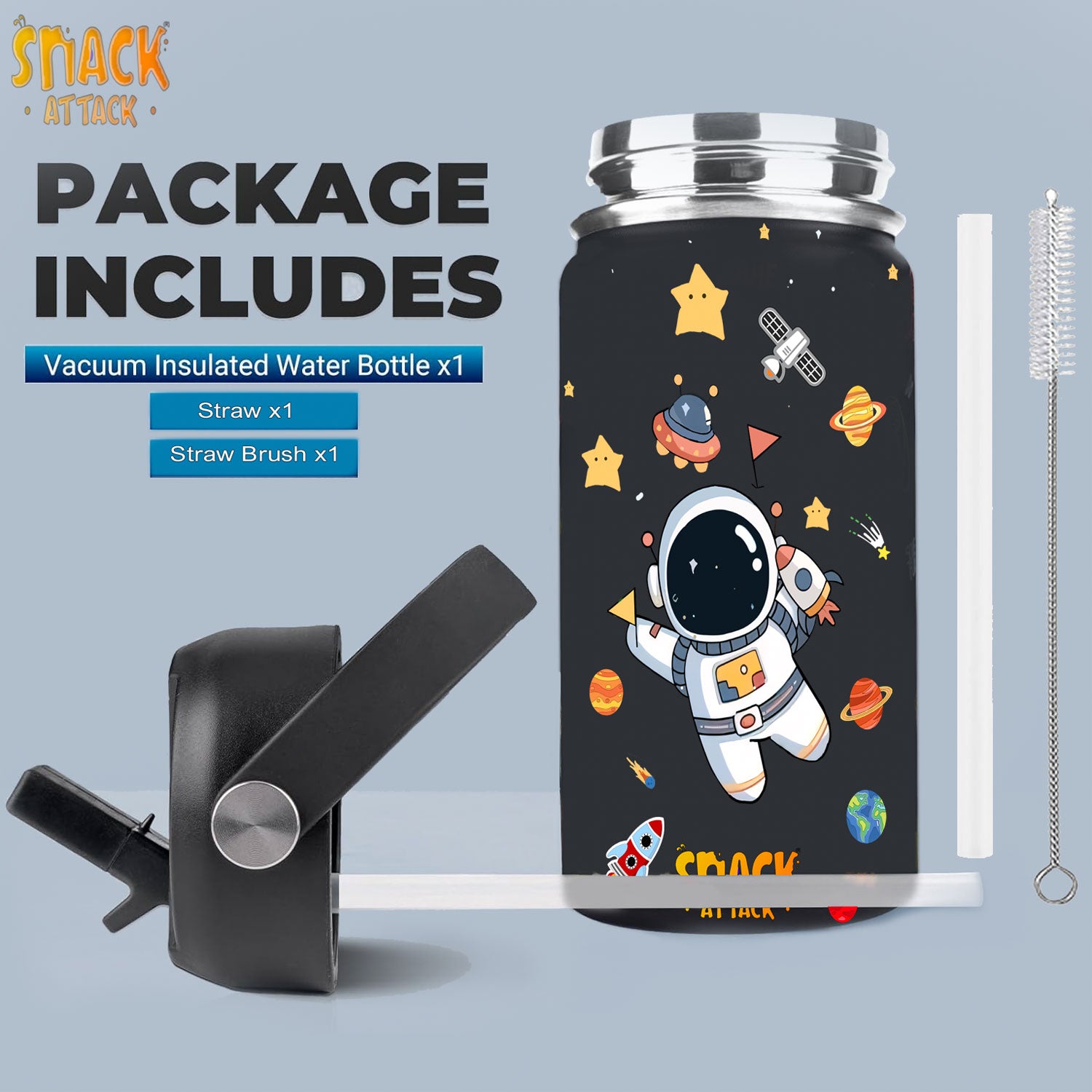 - ★HAND WASH ONLY: Snack Attack kids insulated water bottle is made of premium 18/8 stainless steel, fully resistant to oxidation and corrosion. This water bottle comprises BPA-free, food-safe, non-toxic materials, making it safe for your kids. In order to maintain the vibrant colors, please clean the cup by hand washing. This metal water bottle includes 1 Kids Stainless Steel Water Bottle, 1 Leak Proof Lid, 1 Straws, 1 Straw Cleaning Brush.