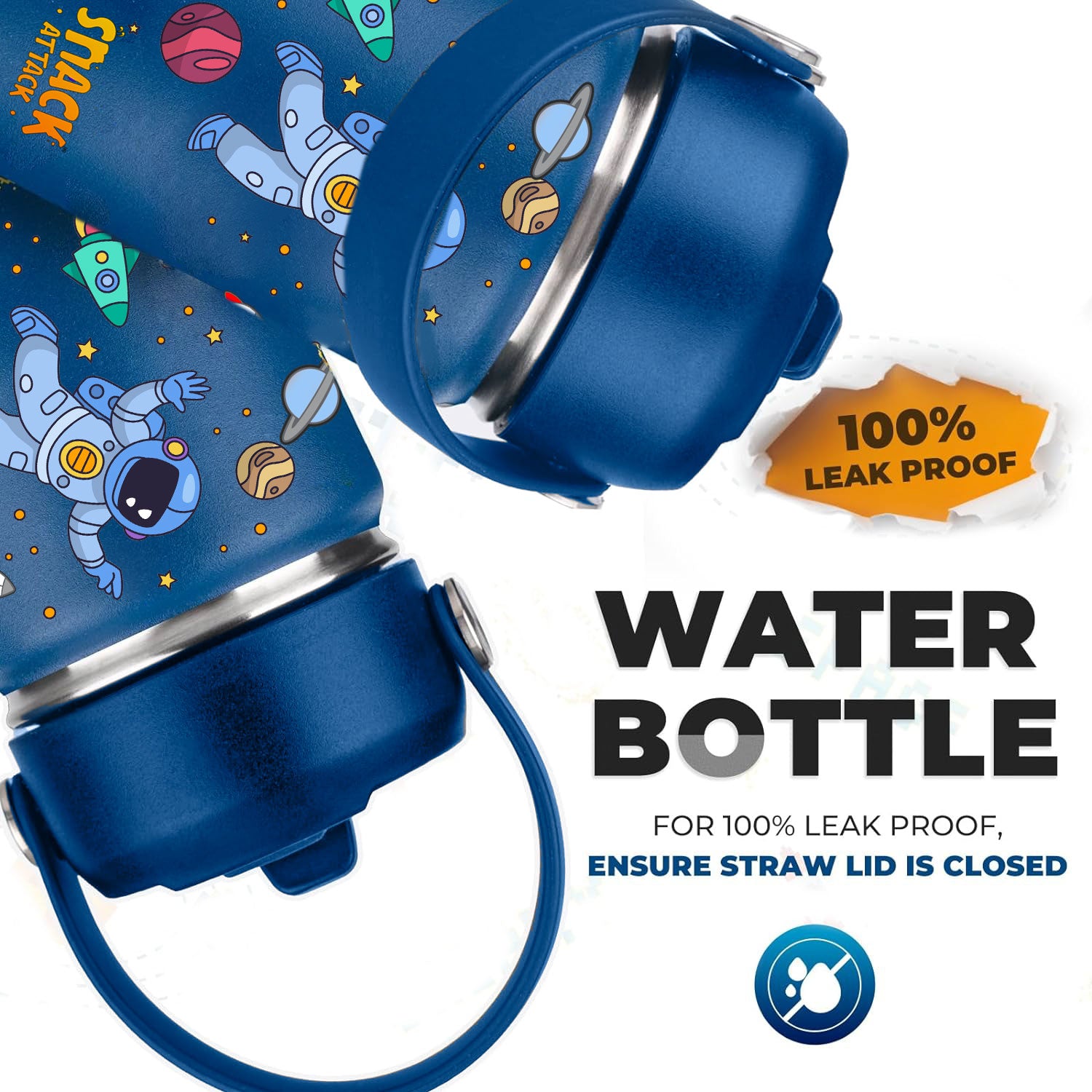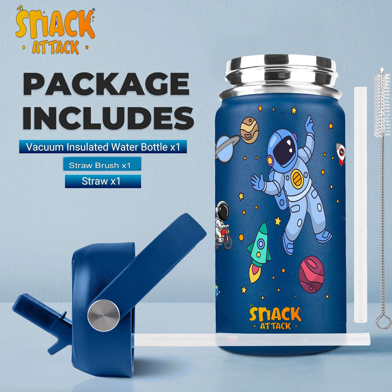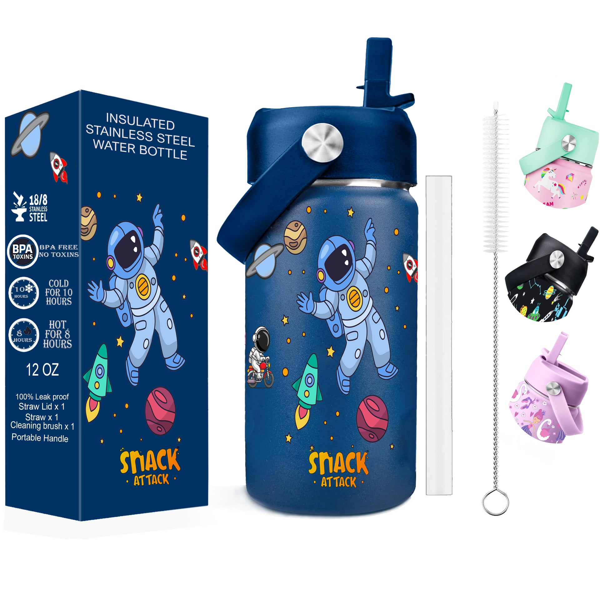 - ★HAND WASH ONLY: Snack Attack kids insulated water bottle is made of premium 18/8 stainless steel, fully resistant to oxidation and corrosion. This water bottle comprises BPA-free, food-safe, non-toxic materials, making it safe for your kids. In order to maintain the vibrant colors, please clean the cup by hand washing. This metal water bottle includes 1 Kids Stainless Steel Water Bottle, 1 Leak Proof Lid, 1 Straws, 1 Straw Cleaning Brush.