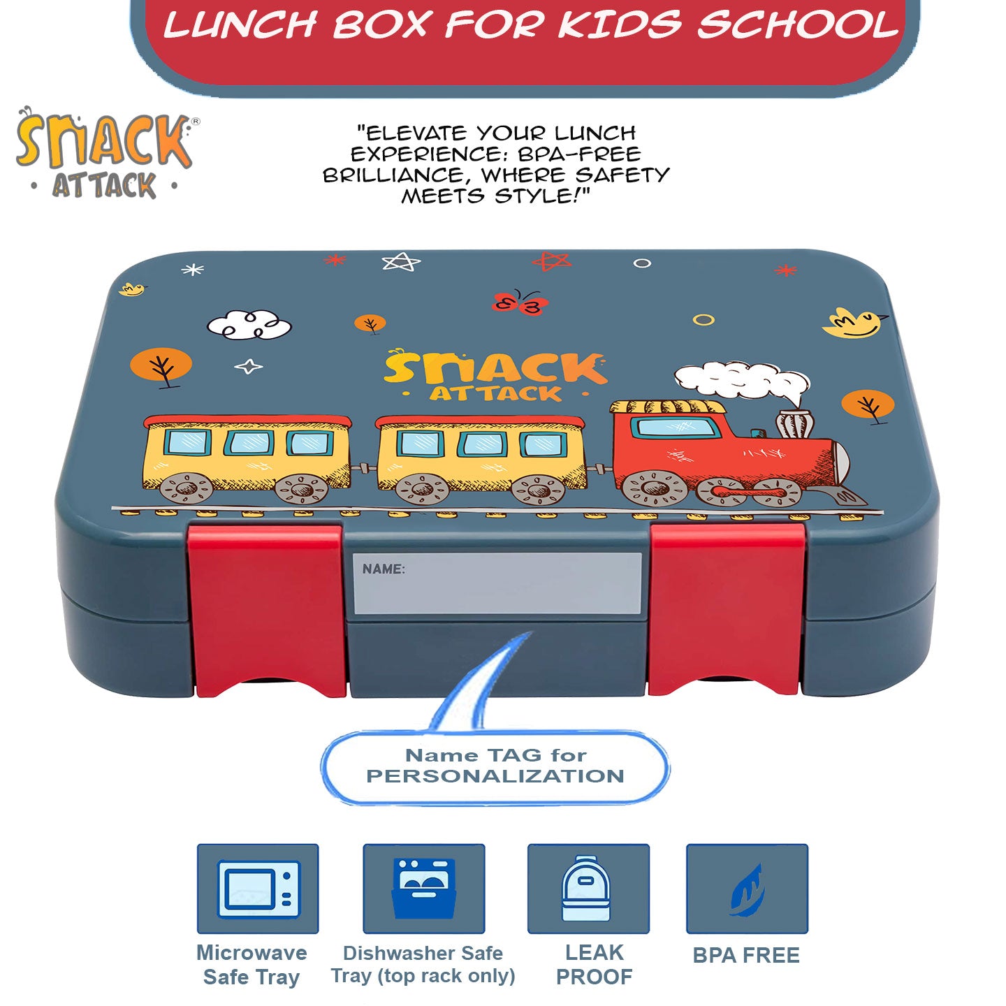 Snack Attack lunch box, bento style, for kids school, 6/4 The convertible compartment is perfect for young children (toddlers to age 14). It offers variety and promotes healthy eating habits. The Snack Attack Bento Style lunch box is perfect for kids school for picky eaters. Pack small portions of your child's favorite foods or bite-size pieces of sandwiches. Its compact size and convertible compartment make it easy for Mom to change the child's favorite foods on a daily basis for good nutrition. Six 1/2-cup portions (approximately 2.75 cups) of the key food groups plus dip/treat well. Pack wet foods like yogurt and dips (not water). This Snack Attack is for kids that like variety. It's perfect for picky eaters. BPA FREE, DISHWASHER SAFE, MICROWAVE SAFE (INNER TRAY)