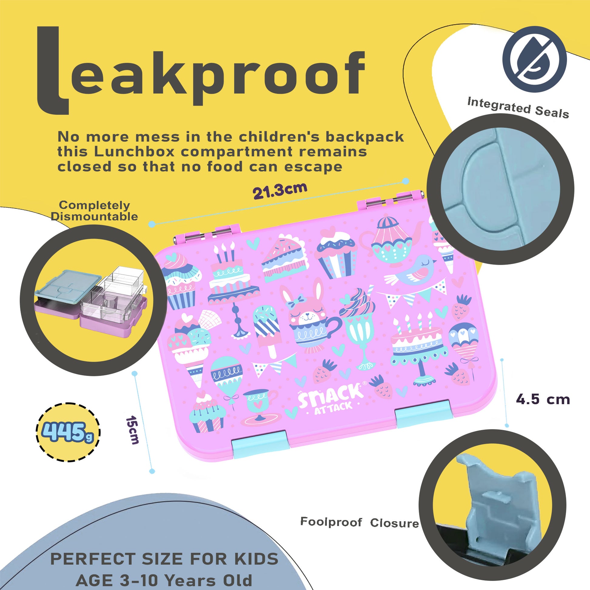Snack Attack lunch box Bento style for kids school 6/4 Convertible Compartment is perfect for young children (toddlers-age 14). It offers variety and promotes healthy eating habits. Snack Attack Bento Style lunch box is perfect kids school for picky eaters. Pack small portions of your child's favorite foods, or bite size pieces of sandwiches. Its compact size and convertible compartment make easy for mum to change the child's favorite foods on daily basis in good nutrition. Six 1/2 cup of portions (approximately 2.75 cups) of the key food groups plus dip/treat well. Pack wet foods like yogurt and dips (not water) This Snack Attack is for kids that like variety. It s perfect for picky eaters. BPA FREE, DISHWASHER SAFE, MICROWAVE SAFE (INNER TRAY)